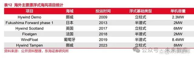 海外漂浮式海风发展已有一定基础。2009 年,挪威国家石油公司 Equinor 开展了全球 首台海上漂浮式样机实测项目,使用立柱式浮式基础。2011 年,全球首套半潜式漂浮式风 电在葡萄牙 WindFloat 1 项目投运。2017 年,全球首个漂浮式海上风电风场——Hywind Scotland 在英国成功投运。2023 年,全球首个商业化运营的漂浮式项目 Hywind Tampen 在 挪威海域投运。漂浮式风电的单机容量也从 2009 年的 2.3MW 上升至 8.4MW。