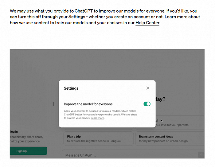 当然,OpenAI也给到了一个隐私保护选项:公告中,OpenAI表示,ChatGPT“可能会使用用户提供的内容来改进模型”,但如果用户不愿意,也可以通过“设置”关闭这项数据收集功能。