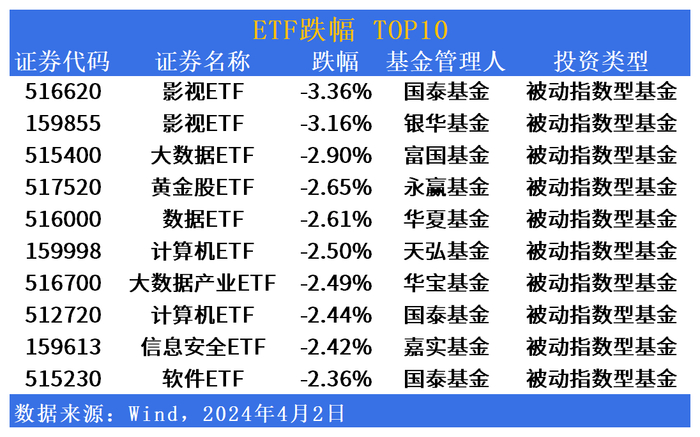 2024年4月2日,Wind数据显示,上证指数缩量收跌0.08%,创业板指跌0.62%。多模态AI题材全线走弱,Kimi、短剧、CPO、算力方向跌幅靠前,低空经济概念股冲高回落;锂电池产业链活跃,基本金属、油气、煤炭等资源股走强。