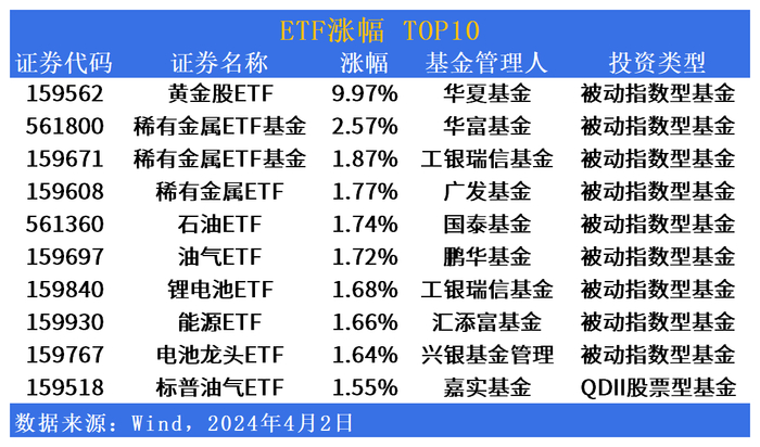 具体来看,黄金股ETF(159562.SZ)涨停,近三日涨幅超30%。稀有金属ETF基金(561800.SH)跟涨超2%,稀有金属ETF基金(159671.SZ)、稀有金属ETF(159608.SZ)跟涨。油气ETF(159697.SZ)、能源ETF(159930.SZ)、标普油气ETF(159518.SZ)今日表现均居市场前列。