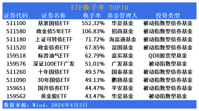 基准国债ETF(511100.SH)、政金债5年ETF(511580.SH)、上证可转债ETF(511180.SH)占据换手率榜前三位。