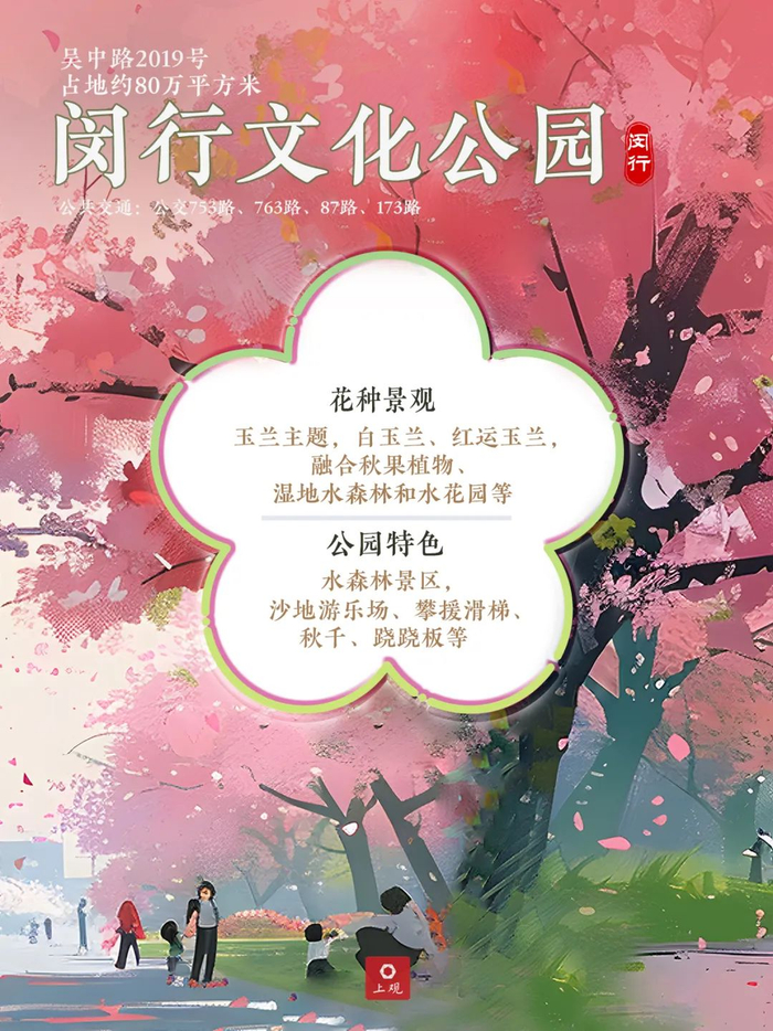 闵行文化公园为上海市首家以玉兰为主题的公园,种植的白玉兰和红运玉兰面积最大、品种最多;也是一座以白玉兰、红运玉兰为主,秋果植物、湿地水森林和水花园等特色融合的生态自然休憩的四星级公园,总面积80多公顷。