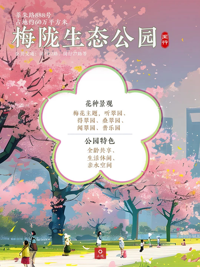 截至目前已基本完成闵行区域内的环城生态公园带建设,闵行文化公园、闵行体育公园、黎安公园、莘庄梅园、梅陇生态公园、春申公园、梅馨陇韵、锦梅公园等,串珠成链、长藤结瓜,形成了近300万平方米的生态成果,为市民提供了更多可休憩、可游览、可参加体育活动的公共空间。