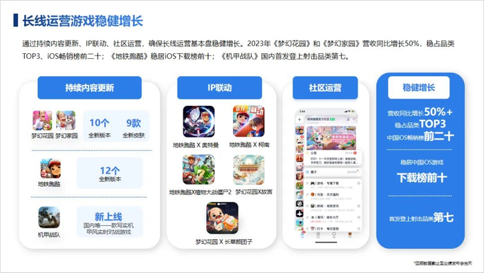 第一,核心产品的生命周期很长、用户黏性很强,例如《地铁跑酷》《梦幻花园》《梦幻家园》等休闲产品,上线超过7年还保持着稳健的收入增长,构成了公司收入的“压舱石”。有人可能认为,休闲产品的生命周期本来就很长,这不足为奇;可是只要我们看看App Store休闲类游戏榜单就会发现,能够连续3年位居前列的产品就堪称不朽了,遑论7年!2023年,《地铁跑酷》稳居中国iOS游戏下载榜前十;“梦幻系列”游戏营收较2022年同期激增超50%,稳占品类TOP3、iOS畅销榜前二十,令人印象非常深刻,充分地体现了公司的长线运营能力。