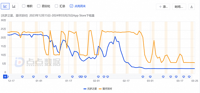 结合二者的下载量。不难发现,除了2024年1月初与2月初等少数时间段,《元梦之星》的下载量同样被《蛋仔派对》稳稳压制。虽然在春节期间,《元梦之星》的下载量迎来了一次大的回升,但对比《蛋仔派对》依旧有不小的差距。其下载量也从高峰时的24万左右,一路下跌至如今的3万左右。