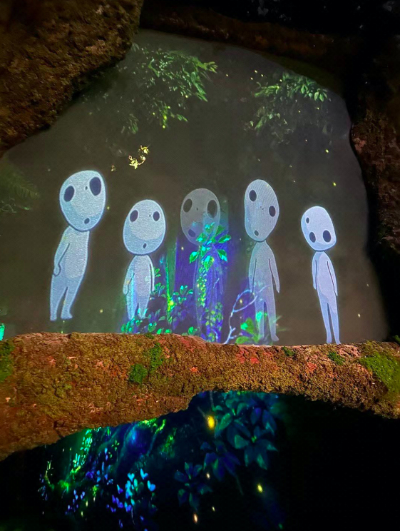 一张《风之谷》动态海报漂浮在空中,如同被施以魔法般,召唤着人们探寻吉卜力奇幻王国,影响几代人的光影回忆扑面而来。天花板上有《红猪》里波尔克的飞行器,耳边传来轰隆隆的飞机声响;玻璃壁橱里放着一排排面包,是《魔女宅急便》刚烤出炉的;花园中停着一辆巨大的猫咪巴士,观众可以坐在前面的木桩上拍照;一片幽暗的森林来自《魔法公主》里的场景,许多可爱的小精灵会探出脑袋来张望你;还有波妞的水底世界,来自《悬崖上的金鱼姬》……
