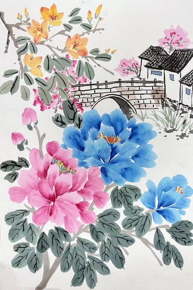 “庭前芍药妖无格, 池上芙蕖净少情。 唯有牡丹真国色, 花开时节动京城。”南京市洪武北路小学三年级的余芯蕊选择为唐代诗人刘禹锡的《赏牡丹》配画。在画面中,牡丹盛开,色彩斑斓,春风轻轻拂过,牡丹随风摇曳,花朵饱满而富有生命力。画面背景是一座古桥和几间民居,为作品增添了诗意和古韵。