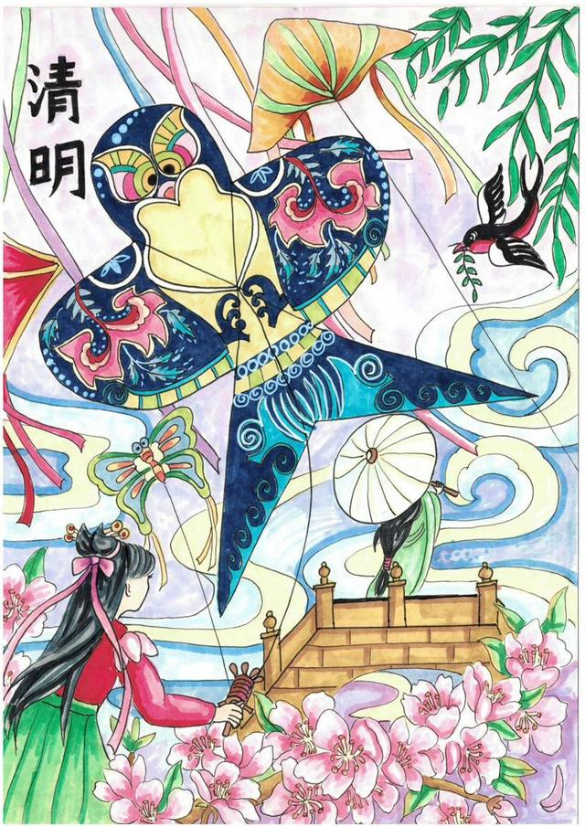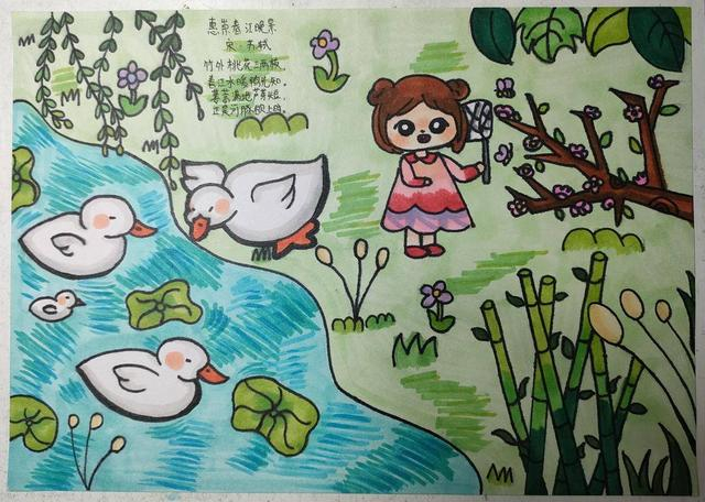 “燕子来时新社,梨花落后清明。”来自南京市石鼓路小学二年级的夏小芮的作品选用了晏殊的《破阵子·春景》。画面中,花儿在枝头轻轻摇曳,燕子衔来柳枝飞进五彩斑斓的春天。一位长发飘飘的古装少女正在放风筝,洋溢着青春的活力,一切都是那么的美好。“竹外桃花三两枝,春江水暖鸭先知。”石鼓路小学五年级的陈思辰则选择了苏轼的《惠崇春江晚景》进行创作。杨柳依依,桃花朵朵,胖嘟嘟的大白鸭在河里自由嬉戏,惹人喜爱。