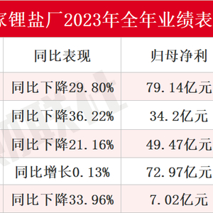 从数据来看,盐湖股份(000792.SZ)2023年归母净利润达79.14亿元,把“锂矿双雄”甩在了身后,另一家盐湖提锂企业藏格矿业39.52%的净利润降幅也远低于行业平均水平。