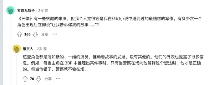 说不完美可能都有些客气,严格来说,是认为非常糟糕,Reddit论坛科幻版块,关于《三体》原作的批评俯拾皆是,不满主要集中在人物和叙事: