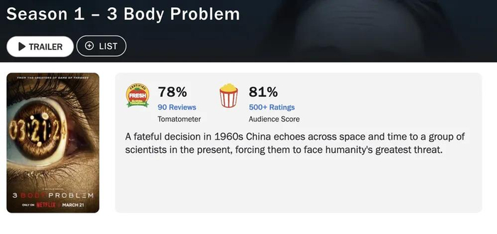 烂番茄网站上,Netflix《三体》评价持续上涨,专业好评度从开分的76%上涨至78%,观众好评度从75%上涨到了81%。