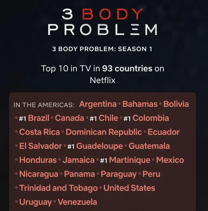 不仅北美,《三体》上线首周,在全球93个国家/地区都跻身TOP10剧集。