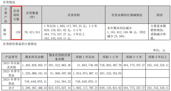 除此之外,去库存也是森马的难题。截至2023年底,其库存量为7042万件,存货金额为33.8亿元,周转天数达159天,也就是说,一件衣服从生产到成功卖出,最高用时需要5个多月。