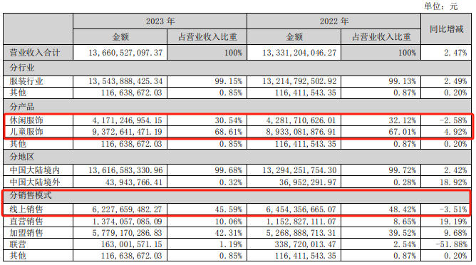 2023年,森马休闲服饰营收41.71亿元,占比30.54%;儿童服饰营收93.73亿元,占比达到68.61%,儿童服饰的毛利率为46.78%,相比2022年度提高了将近5个百分点,并且高于休闲服饰毛利率的38.02%。