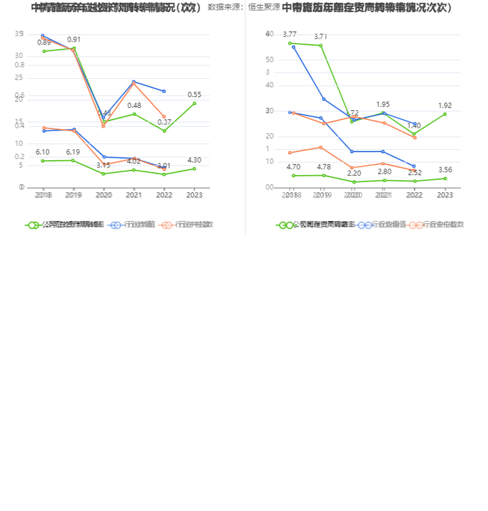 营运能力方面,2023年,公司公司总资产周转率为0.55次,上年同期为0.37次(2022年行业平均值为0.13次,公司位居同行业1/20);固定资产周转率为1.92次,上年同期为1.40次(2022年行业平均值为0.56次,公司位居同行业5/20);公司应收账款周转率、存货周转率分别为4.30次、3.56次。