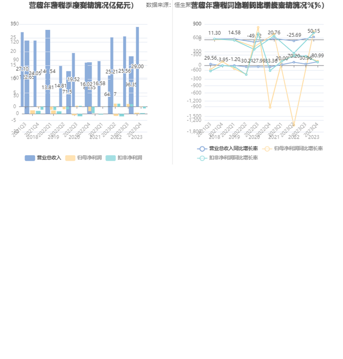 2023年,公司毛利率为24.45%,同比上升8.43个百分点;净利率为3.16%,较上年同期上升10.51个百分点。从单季度指标来看,2023年第四季度公司毛利率为21.00%,同比上升1.25个百分点,环比下降6.31个百分点;净利率为-0.20%,较上年同期上升12.01个百分点,较上一季度下降6.09个百分点。
