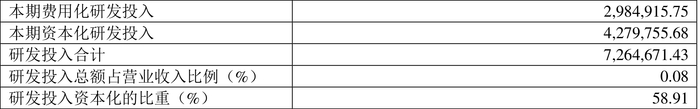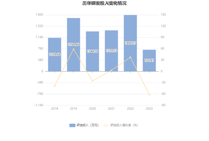 2023年全年,公司研发投入金额为726.47万元,同比下降61.69%;研发投入占营业收入比例为0.08%,相比上年同期下降0.22个百分点。此外,公司全年研发投入资本化率为58.91%。