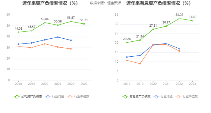 在偿债能力方面,公司2023年年末资产负债率为51.71%,相比上年末下降2.16个百分点;有息资产负债率为31.89%,相比上年末下降1.13个百分点。