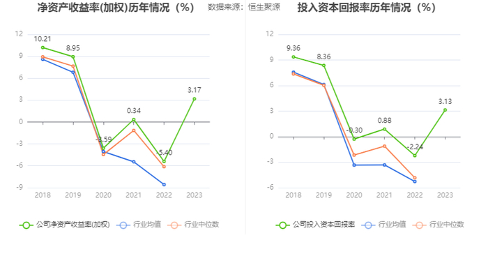 数据显示,2023年公司加权平均净资产收益率为3.17%,较上年同期增长8.57个百分点;公司2023年投入资本回报率为3.13%,较上年同期增长5.37个百分点。