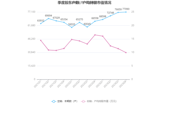 筹码集中度方面,截至2023年年末,公司股东总户数为7.71万户,较三季度末增长了431户,增幅0.56%;户均持股市值由三季度末的11.43万元下降至9.97万元,降幅为12.77%。