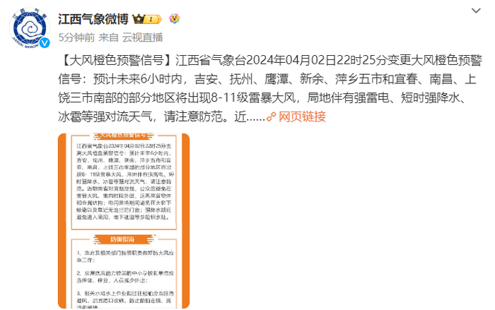 • 江西省气象台2024年04月02日22时25分变更大风橙色预警信号:预计未来6小时内,吉安、抚州、鹰潭、新余、萍乡五市和宜春、南昌、上饶三市南部的部分地区将出现8-11级雷暴大风,局地伴有强雷电、短时强降水、冰雹等强对流天气,请注意防范。