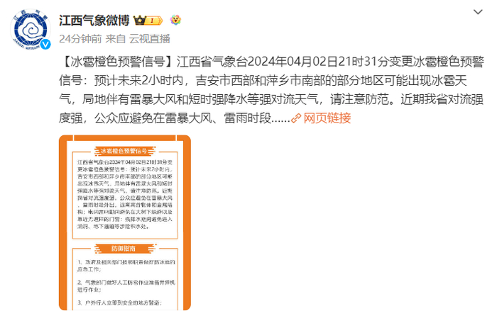 • 江西省气象台2024年04月02日21时31分变更冰雹橙色预警信号:预计未来2小时内,吉安市西部和萍乡市南部的部分地区可能出现冰雹天气,局地伴有雷暴大风和短时强降水等强对流天气,请注意防范。