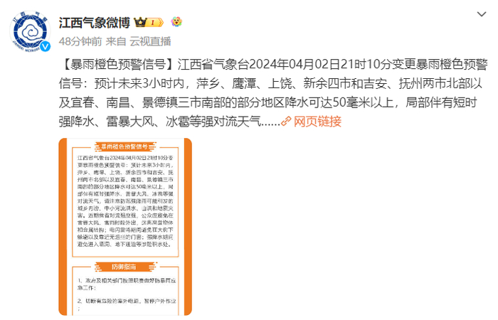 • 江西省气象台2024年04月02日21时10分变更暴雨橙色预警信号:预计未来3小时内,萍乡、鹰潭、上饶、新余四市和吉安、抚州两市北部以及宜春、南昌、景德镇三市南部的部分地区降水可达50毫米以上,局部伴有短时强降水、雷暴大风、冰雹等强对流天气,请注意防范强降雨可能引发的城乡内涝、中小河流洪水、山洪和地质灾害。