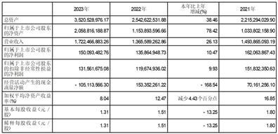截至2023年12月31日,公司总资产为3,520,528,976.17元,较去年同期增长38.46%;归属于母公司股东权益为2,058,816,188.87元,较去年同期增长78.42%。报告期内,公司实现营业收入1,722,466,883.26元,较去年同期增长26.13%;营业利润为186,774,256.26元,较去年同期增长20.83%;利润总额为186,756,272.37元,较去年同期增长16.84%;实现归属于上市公司股东净利润150,093,482.76元,较去年同期增长10.47%;实现扣除非经常性损益后归属于上市公司股东净利润131,561,675.08元,较去年同期增长9.93%。