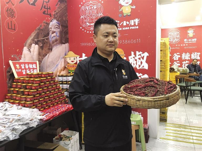 在这个满是餐饮店的四合院里,海英麻辣烫隔壁的店是一家经营甘谷辣椒、花椒特产店。走进去,才发现它原来是一家米粉店连夜“爆改”的。“天水麻辣烫的灵魂味道就来自甘谷辣椒、花椒。我们在政府扶持下,在流量中心地带连夜开业这家特产店,主要是做窗口展示,推广天水农产品。小店背后我们还有完整的产业链、交易市场作支撑。”在深圳创业10年的甘谷“90后”青年巩士杰是甘肃农小胖农业科技发展有限公司负责人,2017年返乡创业看中了农业板块,做得有声有色。而这一次,有外贸经验的他很快又抓住了流量契机。