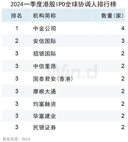 中金公司以全球协调人身份参与了4家IPO,位居全球协调人排行榜第一位;安信国际参与了3家IPO,位居第二位。