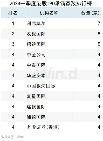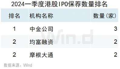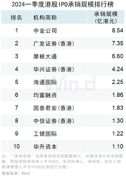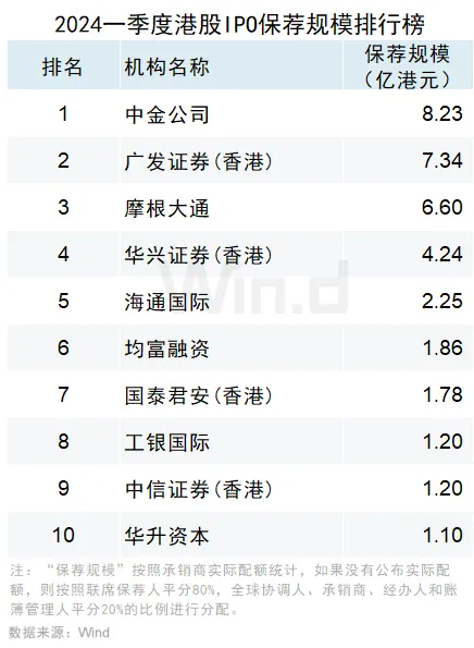 2024年一季度港股承销排行榜:中金公司IPO承销保荐位居榜首