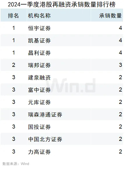 恒宇证券、凯基证券和昌利证券以承销商身份各参与了4起再融资事件,并列第一名。