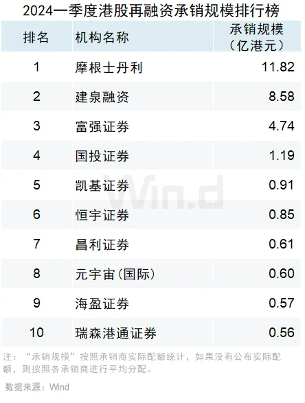 摩根士丹利以11.82亿港元的再融资承销规模位列第一,承销数量1起;建泉融资以8.58亿港元的承销规模位列第二,承销数量2起;富强证券以4.74亿港元的承销规模位列第三,承销数量1起。