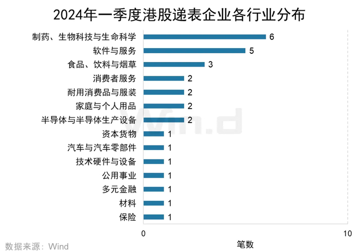 从各行业首次递交上市申请数量来看,2024年一季度共有29家企业在香港交易所首次递交上市申请。其中,制药、生物科技与生命科学行业共有6家企业递表,位列第一;软件与服务行业共5家企业递表,位列第二名;食品、饮料与烟草行业共3家企业递表,位列第三名。