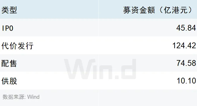 2024年一季度港股一级市场股权融资总金额为255亿港元,较去年同期融资金额321亿港元同比减少20.55%。其中,IPO融资规模为46亿港元,较去年同期下降31.17%;配售融资规模为75亿港元,较去年同期锐减63.44%;供股融资规模为10亿港元,较去年同期减少55.52%;代价发行融资规模增长较为显着,共募集124亿港元,较去年同期大幅增长351.10%。