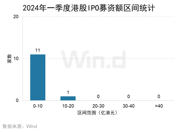 2024年一季度港股IPO融资金额在10亿港元以下的数量最多,高达11家,占到IPO总数的91.67%;其次是募资金额在10-20亿港元的区间,家数为1家。