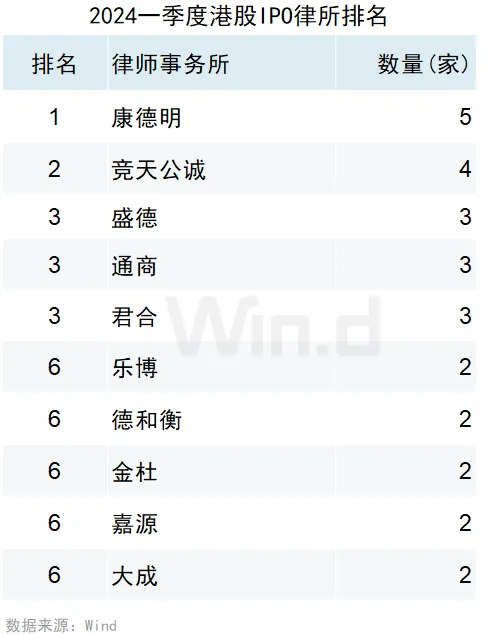 IPO律师(含境内外业务)方面,康德明律师事务所参与了5家IPO,位列第一;竞天公诚律师事务所参与了4家IPO,位列第二;盛德、通商和君合律师事务所均以参与了3家IPO位列第三。