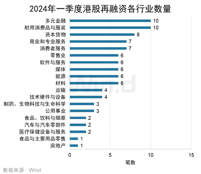 从各行业再融资数量来看,多元金融以及耐用消费品与服装行业的再融资项目数量为10起,并列第一;资本货物行业以8起位列第二;商业和专业服务以及消费者服务行业以7起位列第三。
