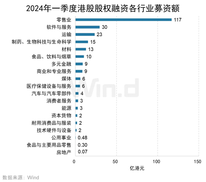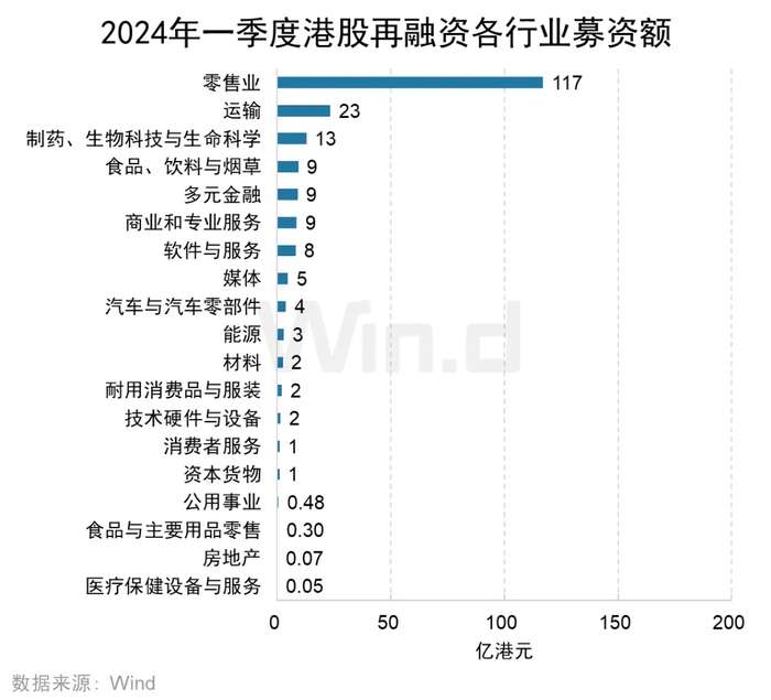 从各行业融资金额来看,零售业为唯一一个募资超百亿的行业,募资金额为117亿港元。