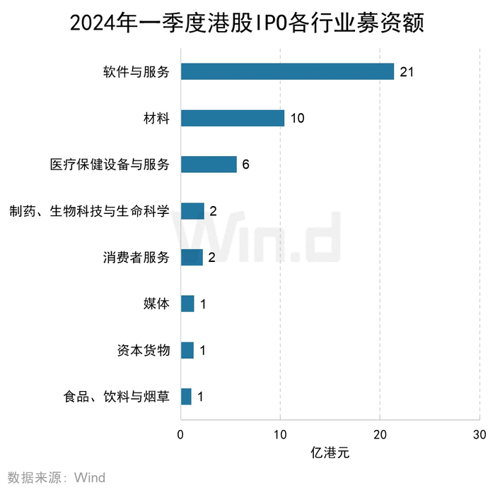 从各行业IPO募资金额来看,IPO募资规模最高的行业为软件与服务,募资总计21亿港元;其次为材料行业,募资金额为10亿港元;医疗保健设备与服务行业位居第三,募资金额为6亿港元。