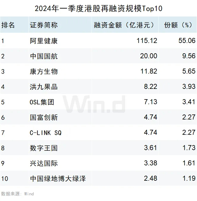 再融资募集金额最高的企业是阿里健康,募资金额达115.12亿港元,占2024年一季度再融资总规模的55.06%;中国国航以20亿港元的募资规模位居第二;康方生物以11.82亿港元的募资规模位居第三。