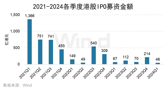 2024年一季度IPO募集金额共46亿港元,较去年同期的67亿港元减少31.17%。