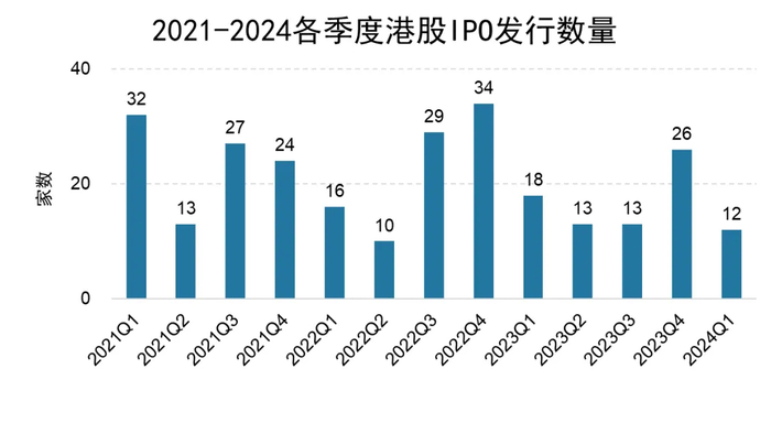 2024年一季度港股IPO发行数量为12家,较去年同期的18家减少33.33%。