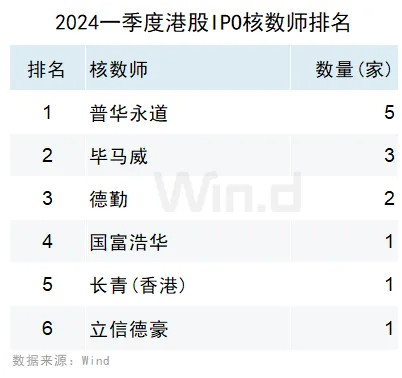 普华永道参与了5家IPO,位列核数师排名中的首位;毕马威参与了3家IPO,位列第二;德勤参与了2家IPO,位列第三。