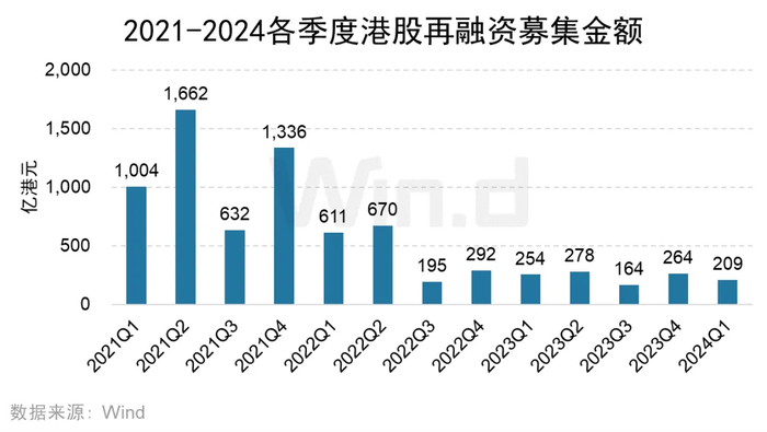 2024年一季度,再融资募集总额为209亿港元,较去年同期的254亿港元减少17.77%。再融资项目数量为94起,较去年同期的85起增长10.59%。