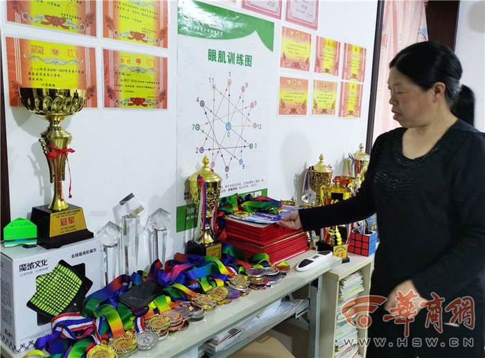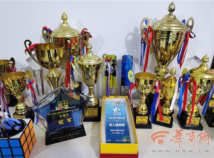 吴子钰家住西安市未央区辛家庙街道煤机花园,家中客厅的一面墙壁上挂满了他在各级魔方比赛中取得的获奖证书,奖牌、奖杯也都摆放在家中显眼位置。