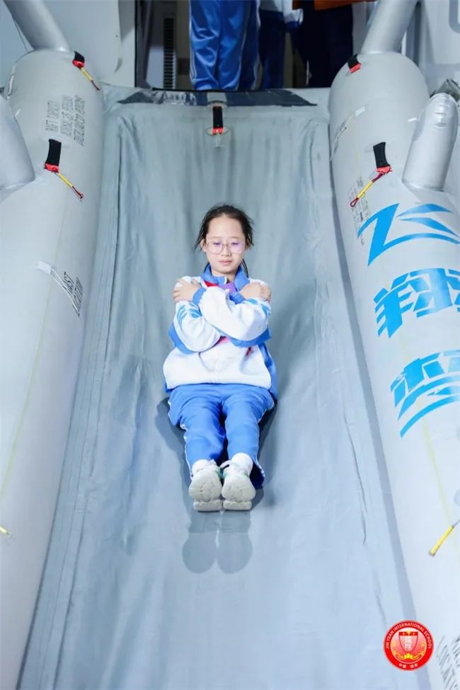 在动态模拟舱内,学生们亲身体验到了飞机滑行、起飞、巡航、气流颠簸、舱外失火、降落、迫降等紧急情况,了解了黄金90秒和黑色13分钟的重要性。辅导员组织学生进行航空应急撤离演练,体验飞机逃生滑梯、救生衣的作用,增强了自身的安全防范意识,掌握了飞行器的求生技能。