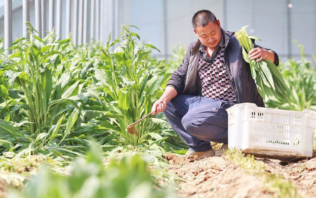 3月14日,在北京市延庆区康庄镇禾亩润丰生态农场,农户正在采收食叶草。