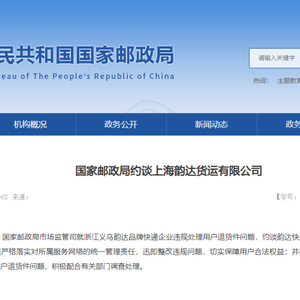 4月2日,国家邮政局市场监管司就浙江义乌韵达品牌快递企业违规处理用户退货件问题,约谈韵达快递总部上海韵达货运有限公司,责令其严格落实对所属服务网络的统一管理责任,迅即整改违规问题,切实保障用户合法权益;并要求其就义乌韵达北苑网点违规处理用户退货件问题,积极配合有关部门调查处理。