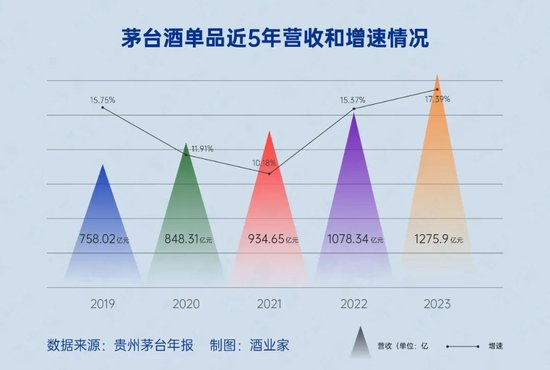 从产品结构来看,在茅台2023年的营收中,茅台酒实现营收1275.9亿,同比增长17.39%,这也创下了近5年来茅台酒的最高增速,这也说明茅台酒大单品在千亿之后仍在拓宽发展的边界,继续以高质量的增长支撑着茅台的大踏步前进。